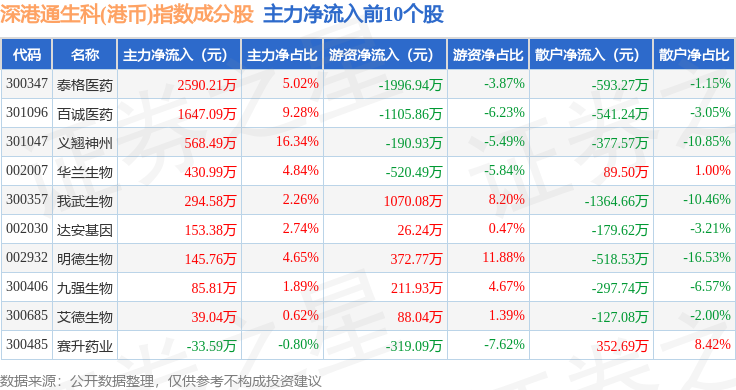 资金流向方面,深港通生科(港币)(983060)指数成份股当日主力资金净流出合计2.75亿元,游资资金净流出合计1328.61万元,散户资金净流入合计2.89亿元。成份股资金流向详情见下表: