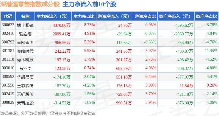 资金流向方面,深港通零售(983073)指数成份股当日主力资金净流出合计3.92亿元,游资资金净流入合计1.61亿元,散户资金净流入合计2.31亿元。成份股资金流向详情见下表: