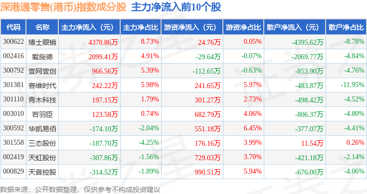 资金流向方面,深港通零售(港币)(983074)指数成份股当日主力资金净流出合计3.92亿元,游资资金净流入合计1.61亿元,散户资金净流入合计2.31亿元。成份股资金流向详情见下表: