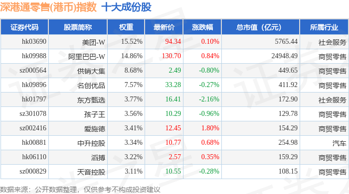 深港通零售(港币)(983074)指数十大成份股详情如下:
