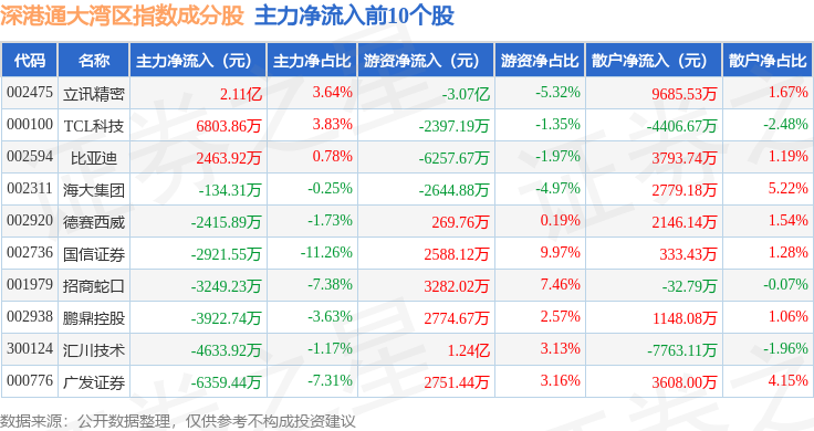 资金流向方面,深港通大湾区(983089)指数成份股当日主力资金净流出合计23.9亿元,游资资金净流入合计4.48亿元,散户资金净流入合计19.43亿元。成份股资金流向详情见下表: