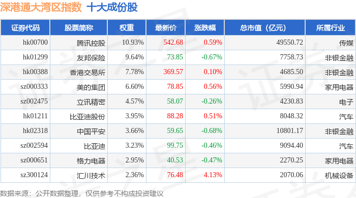 深港通大湾区(983089)指数十大成份股详情如下: