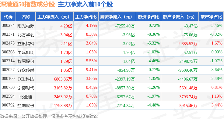资金流向方面,深港通50(983091)指数成份股当日主力资金净流出合计9.98亿元,游资资金净流出合计2.36亿元,散户资金净流入合计12.34亿元。成份股资金流向详情见下表: