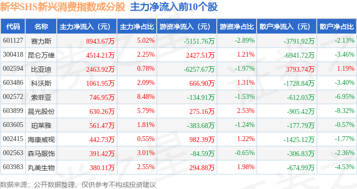 资金流向方面,新华SHS新兴消费(989006)指数成份股当日主力资金净流出合计5.02亿元,游资资金净流入合计2.29亿元,散户资金净流入合计2.73亿元。成份股资金流向详情见下表:
