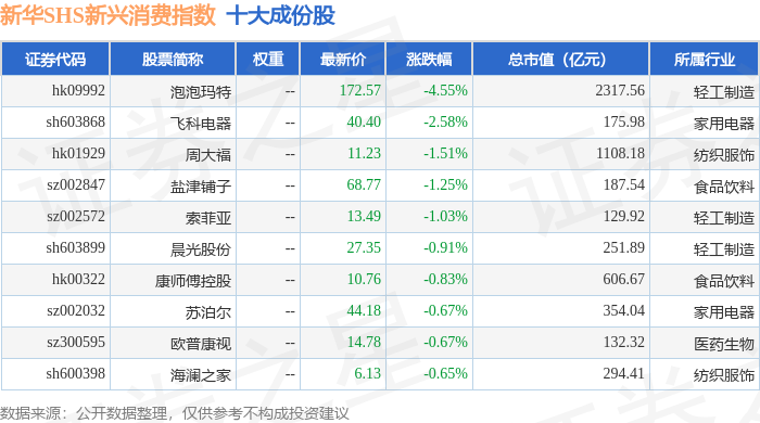 新华SHS新兴消费(989006)指数十大成份股详情如下: