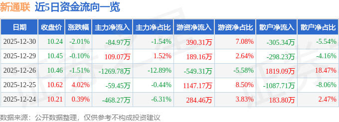 证券之星消息,截至2025年12月30日收盘,新通联(603022)报收于10.24元,下跌2.01%,换手率2.68%,成交量5.36万手,成交额5514.18万元。
