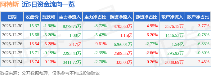 证券之星消息,截至2025年12月30日收盘,阿特斯(688472)报收于15.37元,下跌1.98%,换手率4.56%,成交量61.51万手,成交额9.49亿元。
