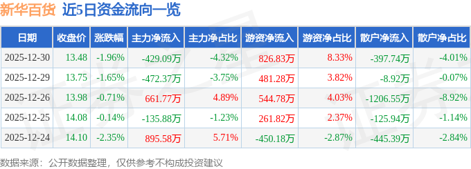 证券之星消息,截至2025年12月30日收盘,新华百货(600785)报收于13.48元,下跌1.96%,换手率3.25%,成交量7.34万手,成交额9922.16万元。