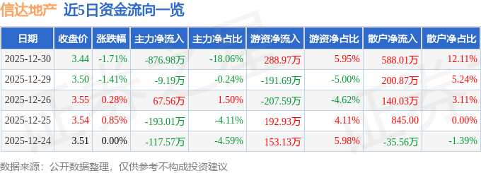 证券之星消息,截至2025年12月30日收盘,信达地产(600657)报收于3.44元,下跌1.71%,换手率0.49%,成交量13.99万手,成交额4856.46万元。