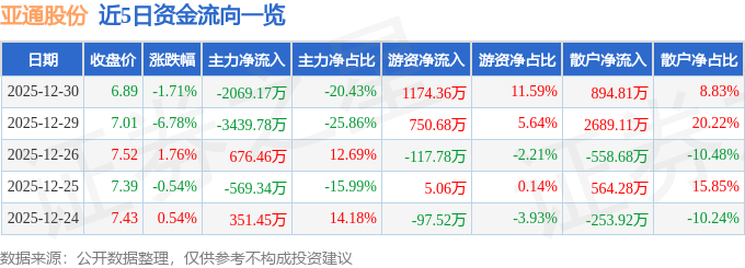 证券之星消息,截至2025年12月30日收盘,亚通股份(600692)报收于6.89元,下跌1.71%,换手率5.79%,成交量14.78万手,成交额1.01亿元。