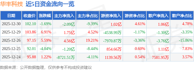 证券之星消息,截至2025年12月30日收盘,华丰科技(688629)报收于102.1元,下跌1.69%,换手率11.88%,成交量21.6万手,成交额22.21亿元。