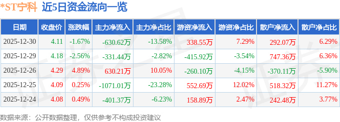 证券之星消息,截至2025年12月30日收盘,*ST宁科(600165)报收于4.11元,下跌1.67%,换手率1.52%,成交量11.18万手,成交额4644.01万元。