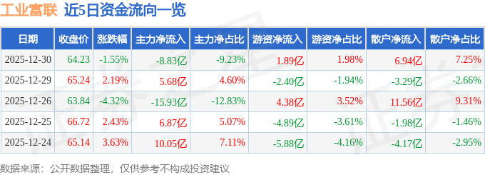 证券之星消息,截至2025年12月30日收盘,工业富联(601138)报收于64.23元,下跌1.55%,换手率0.75%,成交量149.3万手,成交额95.68亿元。