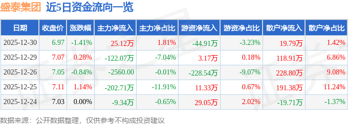 证券之星消息,截至2025年12月30日收盘,盛泰集团(605138)报收于6.97元,下跌1.41%,换手率0.36%,成交量1.98万手,成交额1389.03万元。