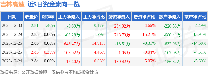 证券之星消息,截至2025年12月30日收盘,吉林高速(601518)报收于2.81元,下跌1.4%,换手率0.95%,成交量17.91万手,成交额5044.79万元。