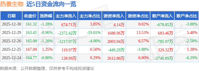 证券之星消息,截至2025年12月30日收盘,热景生物(688068)报收于161.32元,下跌1.28%,换手率1.17%,成交量1.09万手,成交额1.75亿元。