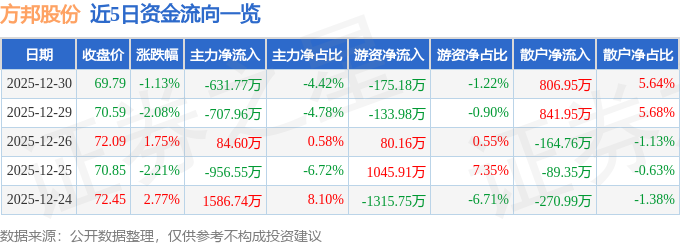 证券之星消息,截至2025年12月30日收盘,方邦股份(688020)报收于69.79元,下跌1.13%,换手率2.45%,成交量2.02万手,成交额1.43亿元。
