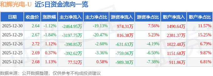 证券之星消息,截至2025年12月30日收盘,和辉光电(688538)报收于2.64元,下跌1.12%,换手率0.84%,成交量48.58万手,成交额1.29亿元。