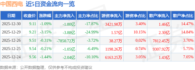 证券之星消息,截至2025年12月30日收盘,中国西电(601179)报收于9.11元,下跌1.09%,换手率2.15%,成交量110.21万手,成交额10.06亿元。