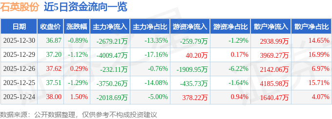证券之星消息,截至2025年12月30日收盘,石英股份(603688)报收于36.87元,下跌0.89%,换手率1.0%,成交量5.43万手,成交额2.01亿元。