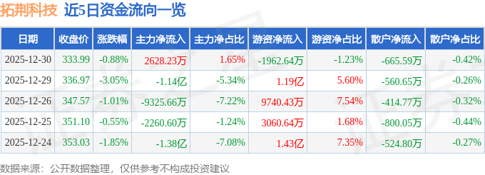 证券之星消息,截至2025年12月30日收盘,拓荆科技(688072)报收于333.99元,下跌0.88%,换手率1.68%,成交量4.73万手,成交额15.94亿元。
