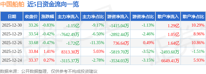 证券之星消息,截至2025年12月30日收盘,中国船舶(600150)报收于33.26元,下跌0.83%,换手率0.5%,成交量37.6万手,成交额12.56亿元。