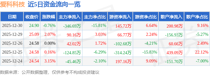 证券之星消息,截至2025年12月30日收盘,爱科科技(688092)报收于24.9元,下跌0.76%,换手率1.06%,成交量8772.0手,成交额2193.22万元。
