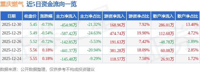 证券之星消息,截至2025年12月30日收盘,重庆燃气(600917)报收于5.45元,下跌0.73%,换手率0.25%,成交量3.9万手,成交额2133.65万元。