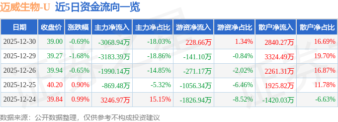 证券之星消息,截至2025年12月30日收盘,迈威生物(688062)报收于39.0元,下跌0.69%,换手率2.13%,成交量4.36万手,成交额1.7亿元。