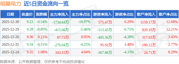 证券之星消息,截至2025年12月30日收盘,明星电力(600101)报收于9.23元,下跌0.54%,换手率1.8%,成交量9.88万手,成交额9141.74万元。