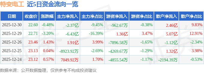 12月30日的资金流向数据方面,主力资金净流出2.37亿元,占总成交额9.45%,游资资金净流出962.67万元,占总成交额0.38%,散户资金净流入2.46亿元,占总成交额9.83%。