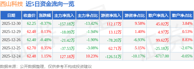 证券之星消息,截至2025年12月30日收盘,西山科技(688576)报收于62.25元,下跌0.37%,换手率0.86%,成交量1881.0手,成交额1170.97万元。