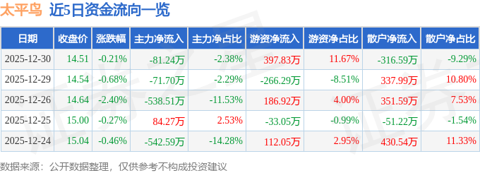 证券之星消息,截至2025年12月30日收盘,太平鸟(603877)报收于14.51元,下跌0.21%,换手率0.5%,成交量2.36万手,成交额3407.88万元。