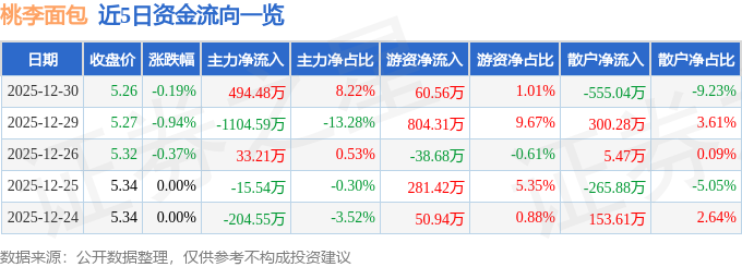 证券之星消息,截至2025年12月30日收盘,桃李面包(603866)报收于5.26元,下跌0.19%,换手率0.71%,成交量11.43万手,成交额6015.82万元。