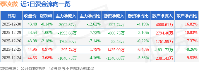 证券之星消息,截至2025年12月30日收盘,泰凌微(688591)报收于43.48元,下跌0.14%,换手率3.24%,成交量5.45万手,成交额2.38亿元。