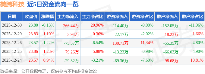 证券之星消息,截至2025年12月30日收盘,美腾科技(688420)报收于23.8元,下跌0.13%,换手率1.28%,成交量5335.0手,成交额1271.03万元。