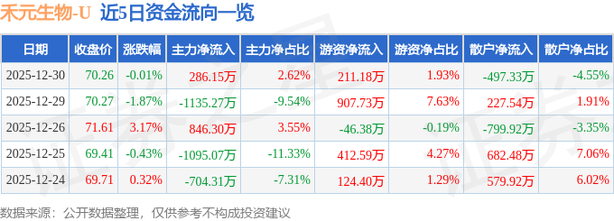 证券之星消息,截至2025年12月30日收盘,禾元生物(688765)报收于70.26元,下跌0.01%,换手率3.76%,成交量1.54万手,成交额1.09亿元。