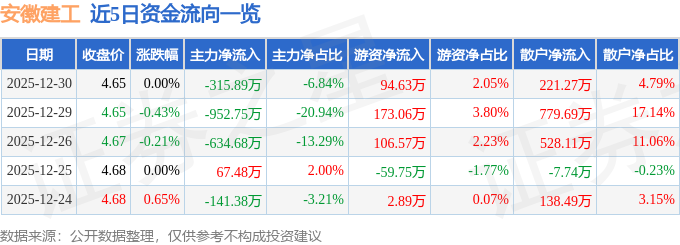证券之星消息,截至2025年12月30日收盘,安徽建工(600502)报收于4.65元,上涨0.0%,换手率0.58%,成交量9.92万手,成交额4616.33万元。