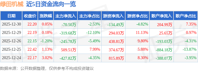证券之星消息,截至2025年12月30日收盘,绿田机械(605259)报收于22.2元,上涨0.05%,换手率0.73%,成交量1.26万手,成交额2790.44万元。
