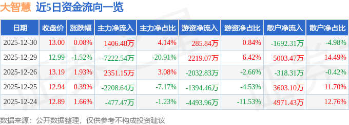 证券之星消息,截至2025年12月30日收盘,大智慧(601519)报收于13.0元,上涨0.08%,换手率1.31%,成交量26.13万手,成交额3.4亿元。
