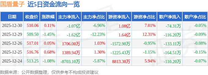 证券之星消息,截至2025年12月30日收盘,国盾量子(688027)报收于510.06元,上涨0.11%,换手率3.71%,成交量2.98万手,成交额15.35亿元。