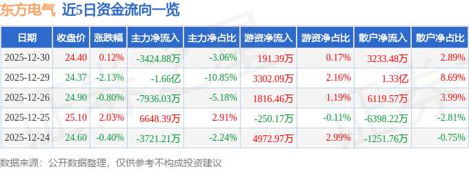 证券之星消息,截至2025年12月30日收盘,东方电气(600875)报收于24.4元,上涨0.12%,换手率2.02%,成交量45.81万手,成交额11.18亿元。
