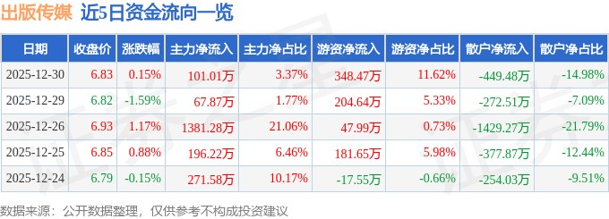 证券之星消息,截至2025年12月30日收盘,出版传媒(601999)报收于6.83元,上涨0.15%,换手率0.8%,成交量4.39万手,成交额2999.97万元。