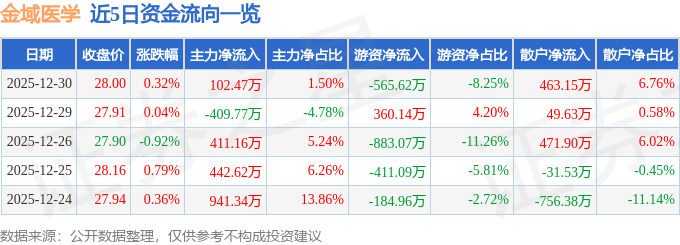 证券之星消息,截至2025年12月30日收盘,金域医学(603882)报收于28.0元,上涨0.32%,换手率0.53%,成交量2.45万手,成交额6852.12万元。