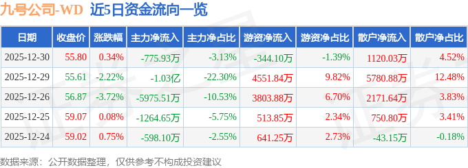 证券之星消息,截至2025年12月30日收盘,九号公司(689009)报收于55.8元,上涨0.34%,换手率0.8%,成交量4.44万手,成交额2.48亿元。