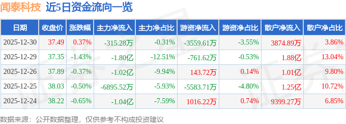 证券之星消息,截至2025年12月30日收盘,闻泰科技(600745)报收于37.49元,上涨0.37%,换手率2.15%,成交量26.74万手,成交额10.04亿元。