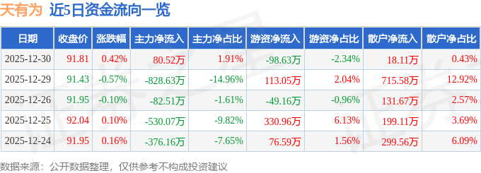 证券之星消息,截至2025年12月30日收盘,天有为(603202)报收于91.81元,上涨0.42%,换手率1.38%,成交量4598.0手,成交额4210.63万元。