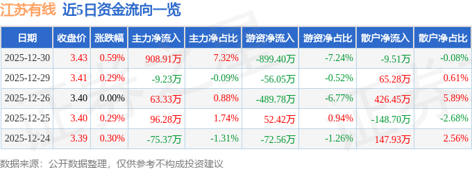证券之星消息,截至2025年12月30日收盘,江苏有线(600959)报收于3.43元,上涨0.59%,换手率0.72%,成交量36.25万手,成交额1.24亿元。