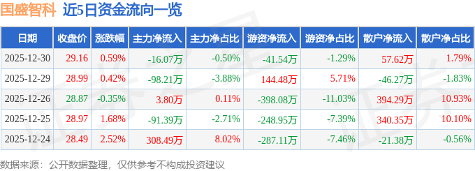 证券之星消息,截至2025年12月30日收盘,国盛智科(688558)报收于29.16元,上涨0.59%,换手率0.84%,成交量1.11万手,成交额3220.66万元。