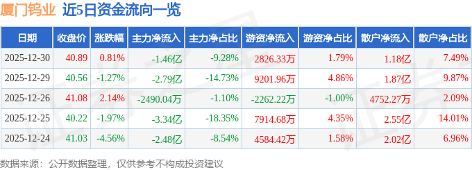 证券之星消息,截至2025年12月30日收盘,厦门钨业(600549)报收于40.89元,上涨0.81%,换手率2.48%,成交量38.61万手,成交额15.78亿元。